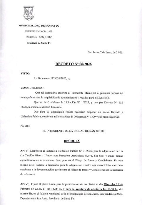 Fíjase el plazo límite para la presentación de las ofertas el día miércoles 11 de febrero de 2026, a las 10 horas y para la apertura de ofertas a las 10.30 horas del mismo día, en el palacio municipal de la Municipalidad de San Justo, Independencia 2525, departamento San Justo, Provincia de Santa Fe.